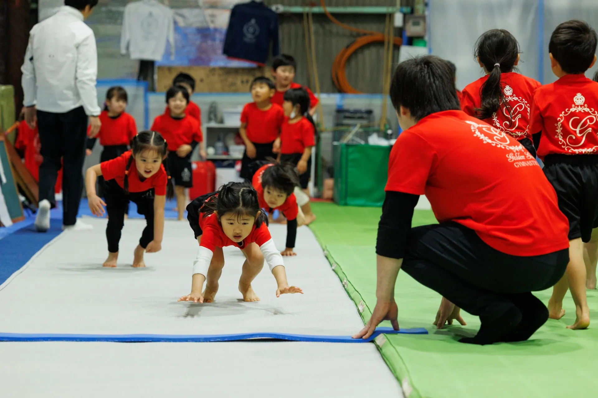 約300平米という広い体育館を利用し、広島で運営している教室では、体育館は縦24m、横12mと広々としており男子4種目・女子4種目の器具が完備されています。子供用の跳び箱や低鉄棒なども用意しているので、どんなレベルのお子様でも安心して練習に取り組むことができます。また、楽しい雰囲気での授業展開を心がけ、お子様たちが楽しく学べるマット運動やトランポリンなど環境づくりにも力を入れています。
